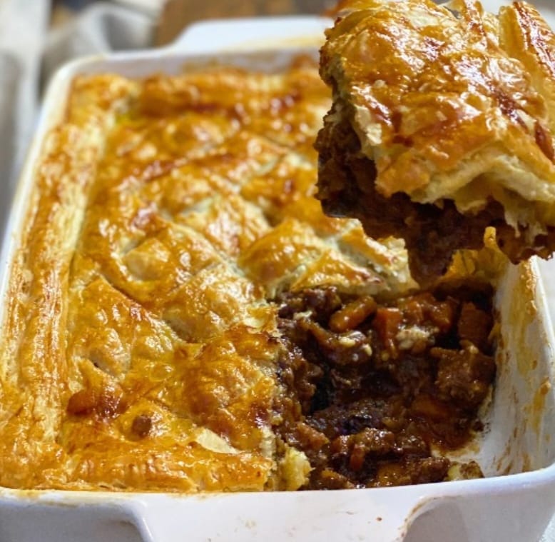 A wholesome classic homemade steak pie, complete with golden-brown flaky pastry and a rich beef filling.